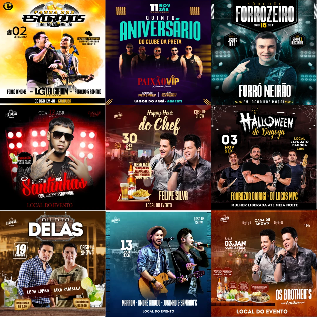 Variedade Ilimitada: São 100 flyers com designs exclusivos, perfeitos para qualquer ocasião: de baladas e shows a casamentos e formaturas. Nunca mais fique sem uma ideia!